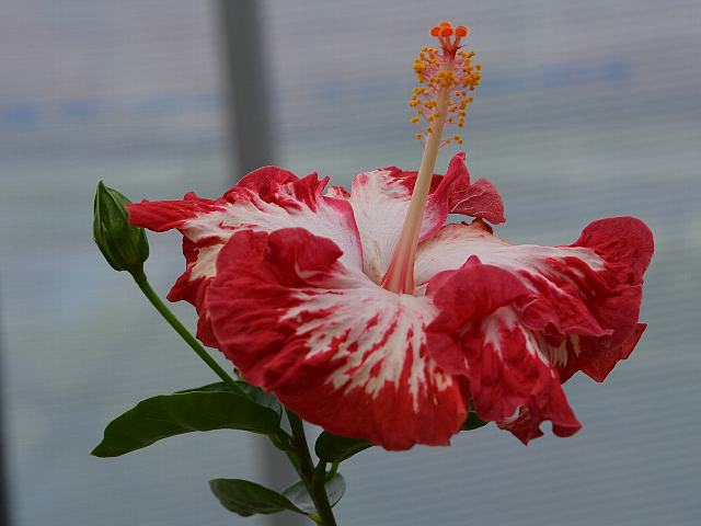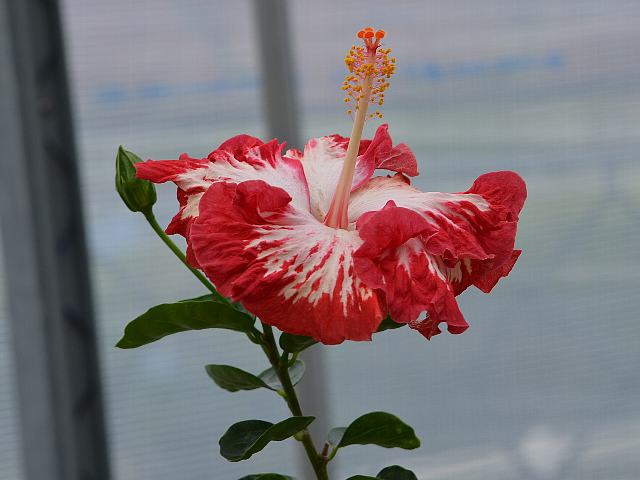 マドンナ 四季咲きの花 2014年08月18日 ハイビスカスはアオイ科フヨウ属の植物の総称である。多くの園芸品種が生まれているが、主にオールド系、ハワイアン系、コーラル系の3系統に分類されている。マドンナ(Madonna)は、ハワイアン系に属する。ハワイアン系はハワイで交配された大輪種で、鑑賞価値が高く数も多い。本種は古くから日本にある品種で、日の丸(ヒノマル)の別名もある。樹高は1メートルから2メートルである。葉は楕円形で、互い違いに生える(互生)。葉の先は尖り、縁には粗いぎざぎざ(鋸歯)がある。開花時期は周年である。一重咲きの大輪である。花の色は白く、真ん中が赤い。花冠はほぼ円形で、深く5つに裂けて重なり合う。花弁の縁はフリル状となる。花柱は下部が赤く、柱頭は朱色である。属名の Hibiscus はギリシャ語由来で「Hibis(エジプトの女神)」の名からきているとの説があり、大形のゼニアオイ属につけられた名である。写真は4月に大阪市の咲くやこの花館で撮った。学名:Hibiscus 'Madonna'★マドンナの名前は花に似合うかな 目を引かれるね日の丸模様花図鑑植物図鑑|味の麺匠戸田久|おこめの鬼平|フロム蔵王|花の本屋さん|楽天トラベル|