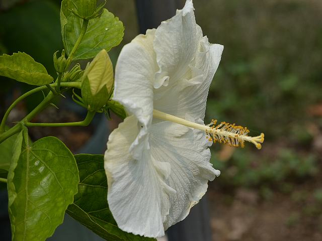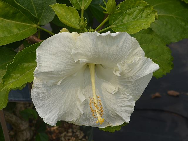 バイロンメッツ 四季咲きの花 2014年08月12日 ハイビスカスはアオイ科フヨウ属の植物の総称である。多くの園芸品種が生まれているが、主にオールド系、ハワイアン系、コーラル系の3系統に分類されている。バイロンメッツ(Byron Metts)は、ハワイアン系に属する。ハワイアン系はハワイで交配された大輪種で、鑑賞価値が高く数も多い。樹高は1メートルから2メートルである。葉は楕円形で、互い違いに生える(互生)。葉の先は尖り、縁には粗いぎざぎざ(鋸歯)がある。開花時期は周年である。一重咲きの大輪である。花の色は白く、表面には皺があり、縁は波打つ。花冠はほぼ円形で、深く5つに裂けて重なり合う。花柱は淡い黄色で、柱頭は黄色い。属名の Hibiscus はギリシャ語由来で「Hibis(エジプトの女神)」の名からきているとの説があり、大形のゼニアオイ属につけられた名である。写真は7月に北大植物園で撮った。学名:Hibiscus 'Byron Metts'★反り返る花弁の先の黄色さが イメージ変える色のマジック花図鑑植物図鑑|味の麺匠戸田久|おこめの鬼平|フロム蔵王|花の本屋さん|楽天トラベル|