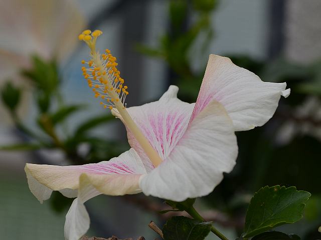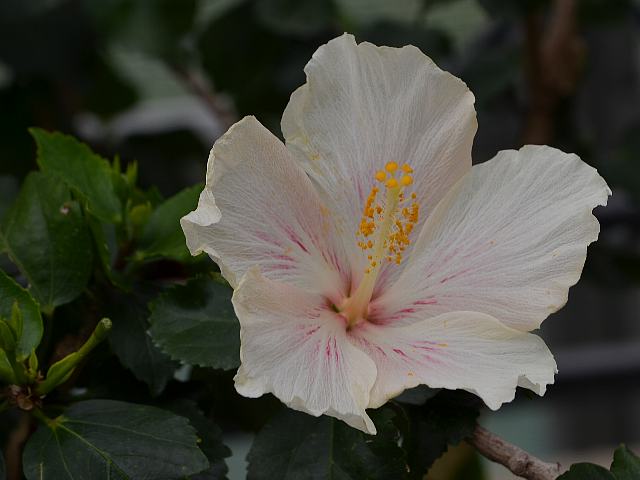 ヒビスクス・ストルキー 四季咲きの花 2014年08月15日 ヒビスクス・ストルキーはアオイ科フヨウ属(ヒビスクス属)の常緑低木である。ヒビスクス属は北半球を中心に250種くらい分布する。また、多くの園芸品種がある。日本にも芙蓉(フヨウ)などが分布するので、属名の和名をフヨウ属という。本種の原産地はフィジー諸島である。1800年代に発見され記録されたきりになっていたが、キュー王立植物園によって再発見された。樹高は150~300センチくらいである。。葉は卵形で、互い違いに生える(互生)。葉の先は尖り、縁には鈍いぎざぎざ(鋸歯)がある。葉には艶がある。葉が手のひら状に裂けることはない。開花時期は周年である。上部の枝先に上向きに咲く花は、花径は10~14センチくらいある。花の色は白く、淡いピンクを帯びるものもある。花弁は5枚、萼片も5枚である。雄しべはたくさんあり、花糸がつけ根の部分で合着して筒状になり突き出る。花柱は淡い黄色で、柱頭は黄色い。花の後にできる実はさく果(熟すると下部が裂け、種子が散布される果実)である。デニソン木槿(デニソンムクゲ)と呼ばれることもある。ハワイアン系と呼ばれる園芸品種の重要な交配親となっている。属名の Hibiscus はギリシャ語由来で「Hibis(エジプトの女神)」の名からきているとの説があり、大形のゼニアオイ属につけられた名である。種小名の storckii はオランダ人の植物収集家8「シュトルク(Jacob Storck, 1800's)さんの」という意味である。写真は4月に大阪市の咲くやこの花館で撮った。学名:Hibiscus storckii(syn. Hibiscus denisonii)★フィジーにハイビスカスがあったのか どんどん広がる新しい夢花図鑑植物図鑑|味の麺匠戸田久|おこめの鬼平|フロム蔵王|花の本屋さん|楽天トラベル|PR