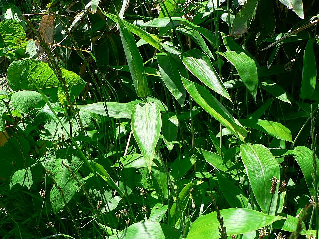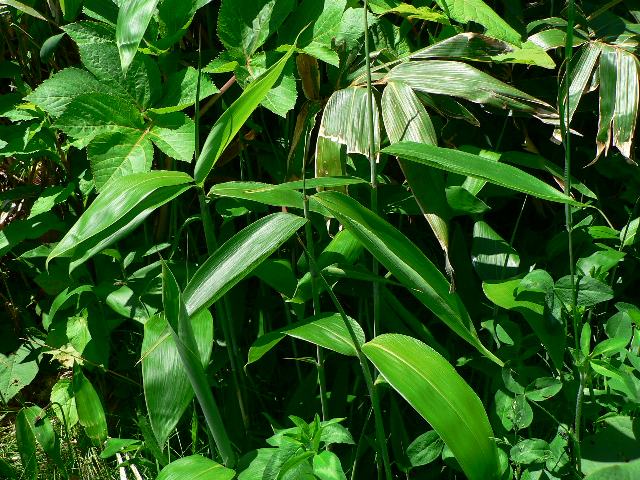 千島笹(チシマザサ) 観葉植物 2014年08月08日 千島笹(チシマザサ)はイネ科ササ属の常緑ササ類である。北方領土を含む北海道と本州の東北地方から中国地方にかけての日本海側に分布し、山地に生える。海外では、朝鮮半島、サハリンにも分布する。草丈は40~300センチくらいである。葉は披針形(笹の葉のような形)で、枝先に互い違いに生える(互生)。葉の質は分厚い革質で、裏面も無毛である。花の咲くのは60年に一度と言われ、北海道では1975年に咲いたという。咲くときは群落全体が咲き、花の咲いた後には結実して枯死する。竹と笹の見分け方は、成長後、茎に皮がついたままなのが笹で、皮がないのが竹である。 桿(かん)と呼ばれる茎の根元が曲がるので根曲がり竹(ネマガリダケ)とも呼ばれている。孟宗竹が育たない北海道では、タケノコと言えば千島笹(チシマザサ)なのである。藪を漕いで採るのは容易ではなく、毎年のように遭難者が出て報道を賑わす。橇(かんじき)などの工芸品を作るのにも利用される。属名の Sasa は日本名の「ササ(笹)」からきている。種小名の kurilense は「クリル諸島(千島列島)の」という意味である。写真は6月に北海道の積丹半島で撮った。学名:Sasa kurilensis★うっそうと茂る野生の千島笹 背丈超えると聞いて驚き花図鑑植物図鑑|味の麺匠戸田久|おこめの鬼平|フロム蔵王|花の本屋さん|楽天トラベル|
