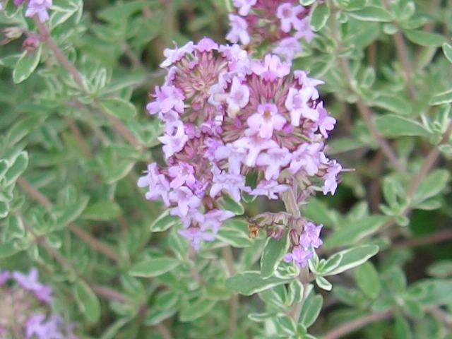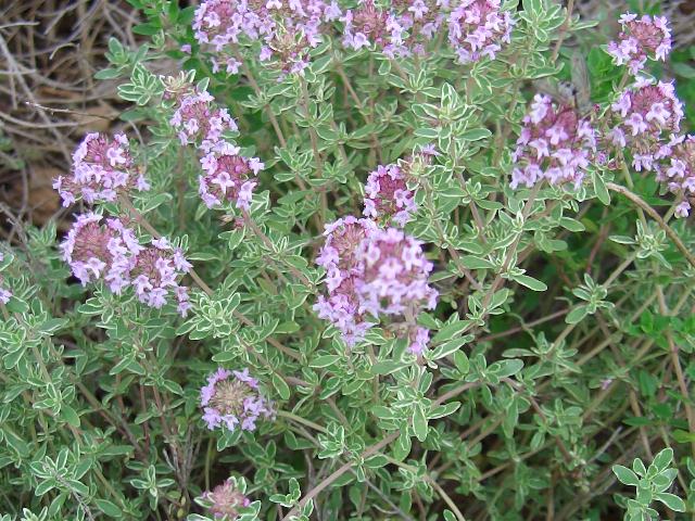 シルバータイム 夏の花 2014年07月04日 レモンタイム(lemon thyme)はシソ科イブキジャコウソウ属の多年草(半低木)である。原産地は地中海沿岸地方である。ブロードリーフタイム(Thymus pulegioides)と立麝香草(タチジャコウソウ:Thymus vulgaris)の交雑種である。シルバータイム(silver thyme)はその園芸品種である。草丈は30~50センチくらいである。木立性である。葉は卵形で、向かい合って生える(対生)。特徴は葉に白い斑が入ることである。また、やわらかなレモンの香りがする。開花時期は6~8月である。茎先に淡い紅紫色の小さな花が集まってつく。花冠は唇形である。花の後にできる実は分果(複数の子房からできた果実)で、4つのブロックからなる。花言葉は「行動力」である。属名の Thymus はギリシャ語の「thyein(香をくゆらす)」からきている。種小名の citriodorus には「レモンのような香りのする」という意味である。品種名の Argenteus は「銀白色の」という意味である。写真は7月に鬼押出しの花木園で撮った。学名:Thymus x citiriodorus 'Argenteus'★葉の色の白が目に染む可憐さに ふと近づけばシルバータイム花図鑑植物図鑑|味の麺匠戸田久|おこめの鬼平|フロム蔵王|花の本屋さん|楽天トラベル|