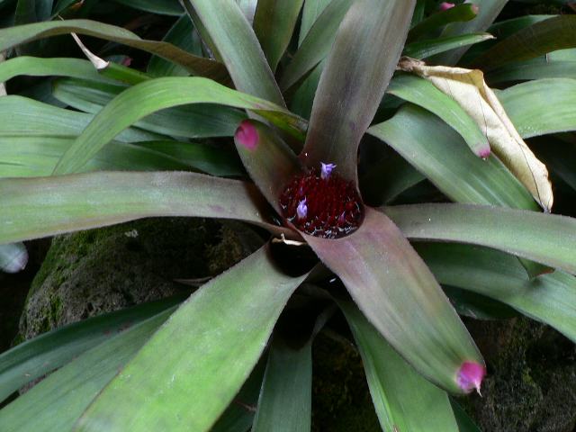 爪紅アナナス(ツマベニアナナス) 夏の花 2014年07月05日 爪紅アナナス(ツマベニアナナス)はパイナップル科ネオレゲリア属の多年草である。ネオレゲリア属は南アメリカに70種くらい分布する着生種で、園芸品種もたくさんある。本種の原産地はブラジルである。和名の由来は、葉先が爪先のように丸くて紅色になることからきている。アナナスは、パイナップル科の植物で観賞価値のあるものの総称である。学名のネオレゲリア・スペクタビリスで表示するものもある。英名はフィンガーネイルプラント(fingernail plant)である。根際から生える葉は長さ30~40センチ、幅4~5センチの線形で輪生する。葉の表面は暗い緑色で茶色がかっており、葉先は紅色になる。葉の裏面は赤紫色で灰白色の横縞が入る。葉の質は革質で、縁には棘がある。開花時期は6~9月くらいである。花茎は伸びず、葉の中に花が咲く。葉のつけ根のほうが淡い紅紫色になり、葉筒の中に剣山のような赤い蕾がたくさんつく。花は淡い青紫色で小さい。属名の Neoregelia はギリシャ語の「neos(新しい)+Regelia(レゲリア属)」からきている。Regelia はロシアの植物学者レーゲル(Eduard August von Regel, 1815-1892)さんの名からきている。種小名の spectabilis は「素晴らしい」という意味である。写真は6月に川口市立グリーンセンターで撮った。学名:Neoregelia spectabilis★爪先にマニキュア塗っているような 葉が面白いピエロのようで花図鑑植物図鑑|味の麺匠戸田久|おこめの鬼平|フロム蔵王|花の本屋さん|楽天トラベル|