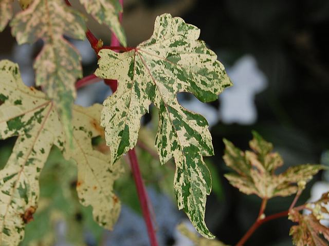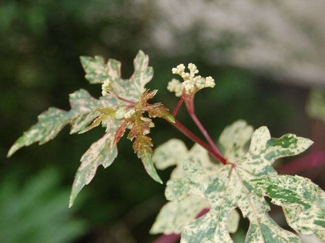 錦野葡萄(ニシキノブドウ) 観葉植物 2014年06月24日 野葡萄(ノブドウ)はブドウ科ノブドウ属の蔓性落葉木本である。北方領土を含む北海道から沖縄にかけて分布し、山地や丘陵、野原などに生える。錦野葡萄(ニシキノブドウ)はその品種の1つである。特徴は、葉に乳白色の斑が入り美しいことである。蔓は長さが3~5メートルくらいになる。茎のつけ根は太く木質化する。葉の形はほぼ円形で、3つから5つに裂ける。葉は互い違いに生え(互生)、縁にはぎざぎざ(鋸歯)がある。葉のつけ根の部分はハート形である。開花時期は6~7月である。葉の脇に集散花序(茎先に花がつき、少し下から横枝が出てその先にも花がつく)を出し、淡い黄緑色の小さな花をたくさんつける。花弁は5枚である。雄しべ5本と雌しべ1本がある。花の後にできる実は球形の液果(果皮が肉質で液汁が多い実)で、淡い緑色から紫色、空色などに変化する。この実は食べられない。茎や葉をすりつぶしたものは生薬の蛇葡萄(じゃほとう)といい、湿布薬となる。根を乾燥したものは生薬の蛇葡萄根(じゃほとうこん)といい、関節痛などに効く。属名の Ampelopsis はギリシャ語の「amperos(ブドウ)+opsis(外観)」からきている。ブドウに外観が似たという意味で名づけられた。種小名の glandulosa は「腺のある」という意味である。変種名の heterophylla は「いろいろの形の葉の」という意味である。品種名の elegans は「優美な」という意味である。写真は6月に小石川植物園で撮った。学名:Ampelopsis glandulosa var. heterophylla f. elegans★ミルクでも零したような葉の姿 驚き見れば花も咲いてる花図鑑植物図鑑|味の麺匠戸田久|おこめの鬼平|フロム蔵王|花の本屋さん|楽天トラベル|
