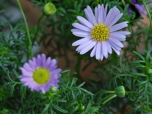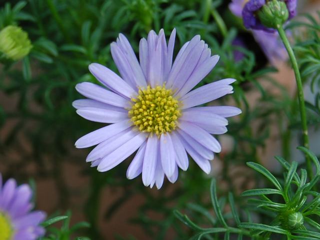 ブラキコメ・マリウスブルー 夏の花 2014年06月25日 ブラキコメ・マリウスブルーはキク科ヒメコスモス属(ブラキコメ属)の多年草である。ブラキコメ属はオーストラリアを中心に70種くらいが分布する。属名の読み方は園芸的にはブラキカムとされる。ブラキコメ・イベリディフォリア(Brachycome iberidifolia)に姫コスモス(ヒメコスモス)の和名があり、属名の和名はヒメコスモス属という。一年草ないし多年草である。夏の湿気に弱いので日本では栽培しにくいとされている。マリウスブルーはその園芸品種である。サイトを見ると、南フランスで改良されたもので夏の暑さに強いという記述もある。ただし、国外のサイトを見てもその園芸品種名と思われる Marius Blue やそれに類似した名は発見できない。ここから推測すると、日本だけで流通している名のようである。草丈は15~20センチくらいである。葉は羽状に細かく切れ込む。開花時期は4~11月くらいである。花径は2~3センチで、花(舌状花)の色は紫色である。真ん中の筒状花は黄色い。花の後にできる実はそう果(熟しても裂開せず、種子は1つで全体が種子のように見えるもの)である。属名の Brachycome は「brachys(短い)+come(毛)」からきている。実の冠毛が短いことから名づけられた。写真は3月にJAあゆみ野安行園芸センターで撮った。学名:Brachycome spp.★花壇にもハンギングにも似合ってる 花期は長いよマリウスブルー花図鑑植物図鑑|味の麺匠戸田久|おこめの鬼平|フロム蔵王|花の本屋さん|楽天トラベル|
