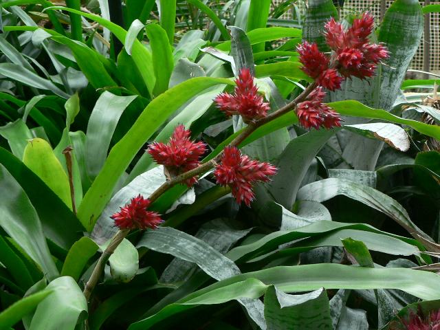 ホヘンベルギア・ステラタ 春の花 2014年06月26日 ホヘンベルギア・ステラタはパイナップル科ホヘンベルギア属の多年草である。属名の読み方はホーエンベルギアとするものもある。ホヘンベルギア属は中南アメリカに52種くらい分布する。本種の原産地も中南アメリカである。草丈は90~120センチくらいである。根際から生える葉は幅の広い線形である。葉には灰白色の鱗片が密生している(両面とも)。開花時期は春から夏である。ロゼット状に生える葉の真ん中から長い花茎を伸ばし、赤い苞(花のつけ根につく葉の変形したもの)をイガのように固まって点々とつけ、中から濃い紫色の小さな花を咲かせる。苞は長期間ついている。属名の Hohenbergia はドイツの植物学への後援者「ホーエンベルグ王子(Prince Hohenberg, 1800's)」の名からきている。種小名の stellata は「星形の」という意味である。写真は6月に川口グリーンセンターで撮った。学名:Hohenbergia stellata★紅色の花と思えばさにあらず 濃い紫の花顔を見せ花図鑑植物図鑑|味の麺匠戸田久|おこめの鬼平|フロム蔵王|花の本屋さん|楽天トラベル|PR