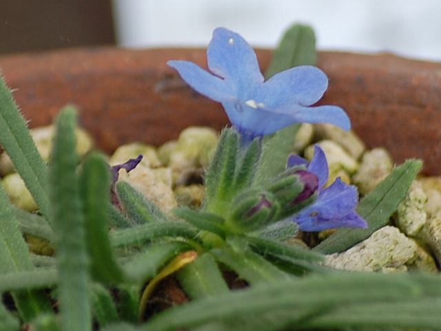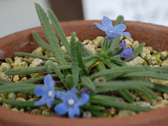 アンクサ・カエスピトサ 春の花 2014年05月14日 アンクサ・カエスピトサはムラサキ科ウシノシタグサ属(アンクサ属)の多年草である。アンクサ属はヨーロッパ、コーカサス、北アフリカ、南アフリカなどに40種くらいが分布する。属名の読み方は園芸的には「アンチューサ」とすることが多い。コーカサスに分布する同属のアンクサ・アズレア(Anchusa azurea)に牛の舌草(ウシノシタグサ)の和名があり、属名の和名もウシノシタグサ属という。本種の原産地はギリシャのクレタ島で、岸壁に生える。草丈は10センチくらいである。葉は細長く、ロゼット状に広がる。葉には軟毛が生えている。開花時期は春から夏である。花の色は青く、花冠は5つに深く裂ける。花の真ん中に白い副花冠がある。花の後にできる実は分果(複数の子房からできた果実)で、4つのブロックからなる。属名の Anchusa はギリシャ語の「anchusa(化粧原料)」からきている。この属の1種の根が化粧原料とされた。種小名の caespitosa は「群がって生える」という意味である。写真は4月に神代植物公園の野草展(東京山草会)で撮った。学名:Anchusa caespitosa★エーゲ海思わすような爽やかさ 岸壁に咲く姿はいかに花図鑑植物図鑑|味の麺匠戸田久|おこめの鬼平|フロム蔵王|花の本屋さん|楽天トラベル|