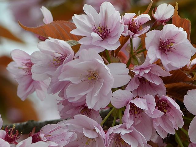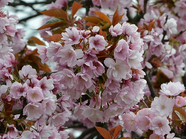 八重紫桜(ヤエムラサキザクラ) 春の花 2014年04月22日 八重紫桜(ヤエムラサキザクラ)はバラ科サクラ属の落葉小高木である。サトザクラの1つである。三好学さんによって小石川植物園で栽培された紫桜(ムラサキザクラ)の実生から生まれた。大山桜(オオヤマザクラ)に近い系統である。樹高は4メートルから7メートルくらいである。葉は楕円形で、互い違いに生える(互生)。葉の縁にはぎざぎざ(鋸歯)がある。葉の両面や葉の柄に毛は生えない。開花時期は4月の中旬から下旬である。葉の展開と同時に花を咲かせる。花径3センチから5センチの大輪で、花弁数は5枚から20枚くらいである。花の色は濃い紅紫色で、花弁の形は円形である。属名の Prunus は「plum(スモモ)」を意味する。種小名の lannesiana はフランス人の園芸家「ランヌ(Lannes)さんの」という意味である。品種名の Purpurea‐plena は「八重で紫色の」という意味である。写真は4月に富山県中央植物園で撮った。学名:Prunus lannesiana 'Purpurea‐plena'★八重に咲く紫の花めずらしく その豪華さにそっと溜息花図鑑植物図鑑|味の麺匠戸田久|おこめの鬼平|フロム蔵王|花の本屋さん|楽天トラベル|