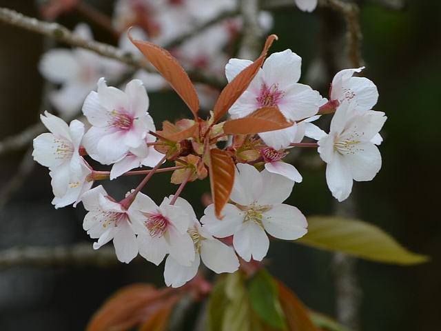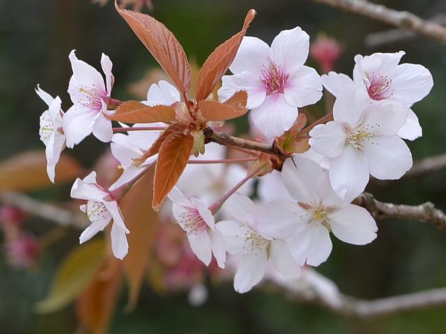 嵐山(アラシヤマ) 春の花 2014年04月23日 嵐山(アラシヤマ)はバラ科サクラ属の落葉高木である。サトザクラの仲間の1つである。荒川堤にあったとされ、明治時代に関東を中心に広まった。名は京都の嵐山に由来する。樹高は5メートルから10メートルである。葉は楕円形で、互い違いに生える(互生)。葉の先は尾状に尖り、縁には鋭い重鋸歯(大きなぎざぎざに更に細かなぎざぎざがある)がある。若葉は紫褐色をしている。開花時期は4月の中旬である。花の色は白ないしごく淡い紅色で、花弁数は5枚から10枚である。花径は4センチくらいの中輪である。萼筒は長い鐘形で萼片にはぎざぎざ(鋸歯)がある。花の後にできる実は核果(水分を多く含み中に種が1つある)で、少し結実をする。属名の Prunus は「plum(スモモ)」を意味する。種小名の lannesiana はフランス人の園芸家「ランヌ(Lannes)さんの」という意味である。写真は4月に富山県中央植物園で撮った。学名:Prunus lannesiana 'Arashiyama'★どこを見て嵐山の名をつけたのか どこか気になる花はシンプル花図鑑植物図鑑|味の麺匠戸田久|おこめの鬼平|フロム蔵王|花の本屋さん|楽天トラベル|