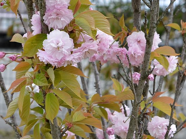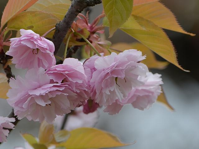 紅時雨(ベニシグレ) 春の花 2014年04月25日 紅時雨(ベニシグレ)はバラ科サクラ属の落葉高木である。サトザクラの仲間の1つである。北海道松前町の浅利政俊さんによって、東錦(アズマニシキ)の実生の中から選出育成された品種である。東錦(アズマニシキ)は荒川堤にあったとされ、佐野藤右衛門さんによって保存され残っている桜である。樹高は5メートルから10メートルである。樹形は盃状で横に広がらない。葉は楕円形で、互い違いに生える(互生)。葉の先は尖り、縁には芒(のぎ:イネなどの小穂に見られる針のような棘)状の重鋸歯(大きなぎざぎざに更に細かなぎざぎざがある)がある。開花時期は4月の下旬である。濃い紅色の八重咲きで、花弁数は25枚から40枚である。花径は5センチくらいある大輪で、垂れ下がって咲く。花弁の外側の色が濃く、波を打つようにうねる。属名の Prunus はラテン語の「plum(スモモ)」からきている。種小名の lannesiana はフランス人の園芸家「ランヌ(Lannes)さんの」という意味である。写真は4月に富山県中央植物園で撮った。学名:Prunus lannesiana 'Beni-shigure'★爛漫の花は見事な紅時雨 降り注ぎ咲くシャワーのように花図鑑植物図鑑|味の麺匠戸田久|おこめの鬼平|フロム蔵王|花の本屋さん|楽天トラベル|