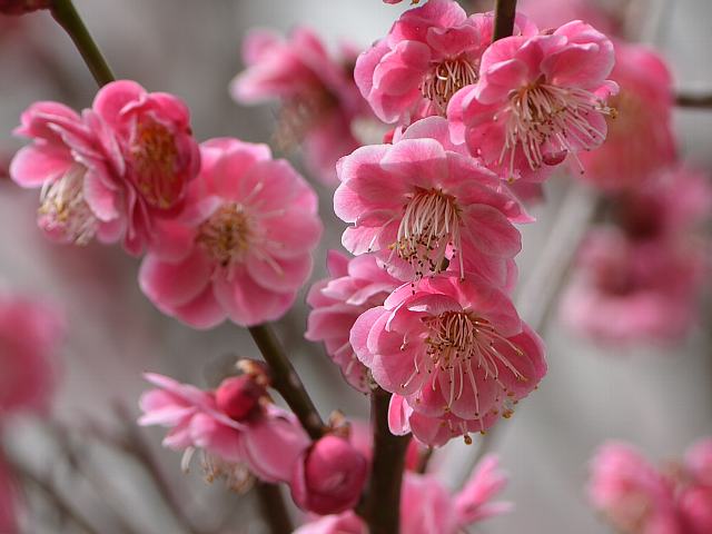 八重唐梅(ヤエトウバイ) 春の花 2014年03月24日 梅(ウメ)はバラ科サクラ属の落葉小高木である。中国原産で、日本へは古代に渡来した。八重唐梅(ヤエトウバイ)はその栽培品種の1つである。樹高は3メートルから6メートルくらいである。葉は楕円形で、互い違いに生える(互生)。開花時期は2月から3月である。早咲きの品種である。葉の展開に先立って花を咲かせる。緋梅系・唐梅性の紅色をした八重咲きの中輪(花径20から25ミリ)である。花弁には赤い筋が入り、下向きに咲く。花の後にできる実は核果(水分を多く含み中に種が1つある)である。一重咲きのものを唐梅(トウバイ)というが、これと区別せずに唐梅(トウバイ)と表示するところもある。属名の Prunus は「plum(スモモ)」を意味する。種小名の mume は「梅」のことである。写真は3月に国営武蔵丘陵森林公園で撮った。学名:Prunus mume 'Yaetobai'★八重に咲く唐梅の花可愛くて目を細め見るまだ早き春花図鑑植物図鑑|味の麺匠戸田久|おこめの鬼平|フロム蔵王|花の本屋さん|楽天トラベル|
