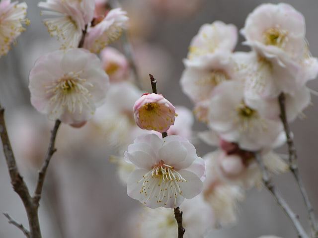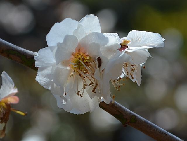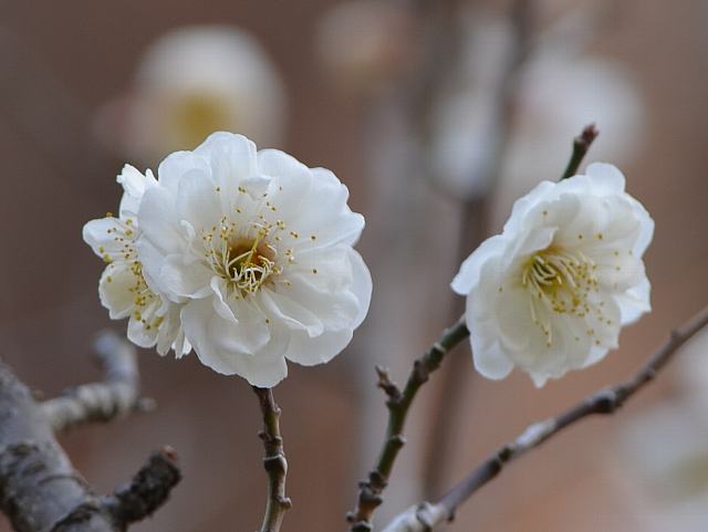 鶯宿枝垂(オウシュクシダレ) 春の花 2014年03月18日 梅(ウメ)はバラ科サクラ属の落葉小高木である。中国原産で、日本へは古代に渡来した。鶯宿枝垂(オウシュクシダレ)はその栽培品種の1つである。樹高は3メートルから6メートルくらいである。葉は楕円形で、互い違いに生える(互生)。野梅系・野梅性の白い八重咲きの中輪(20から25ミリ)である。早咲きの品種である。開花時期は2月から3月である。葉の展開に先立って花を咲かせる。歴史物語「大鏡」の中に平安中期の村上天皇の時代のものとして鶯宿梅にまつわる記述があり、古典落語の演目の1つともされている。属名の Prunus は「plum(スモモ)」を意味する。種小名の mume は「梅」のことである。写真は3月につくば植物園で撮った。学名:Prunus mume 'Oshuku-shidare'★小さくもずっしりとした八重咲きで 華やぎ伝う鶯宿枝垂花図鑑植物図鑑|味の麺匠戸田久|おこめの鬼平|フロム蔵王|花の本屋さん|楽天トラベル|