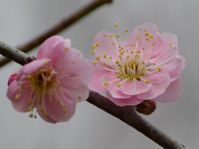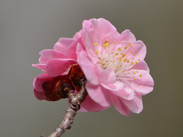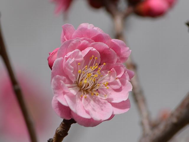 里見紅(サトミコウ) 春の花 2014年03月20日 梅(ウメ)はバラ科サクラ属の落葉小高木である。中国原産で、日本へは古代に渡来した。里見紅(サトミコウ)はその栽培品種の1つである。樹高は3メートルから6メートルくらいである。葉は楕円形で、互い違いに生える(互生)。開花時期は2月から3月である。葉の展開に先立って花を咲かせる。豊後系・豊後性の紅色をした八重咲きの中輪(花径20から25ミリ)である。花弁の数は多く、内側へ入るほど小さい。花弁は内側ほど波打つ。属名の Prunus は「plum(スモモ)」を意味する。種小名の mume は「梅」のことである。写真は3月に国営武蔵丘陵森林公園で撮った。学名:Prunus mume 'Satomikou'★どのような由来があってついた名か 謎は解けぬがいつか知りたく花図鑑植物図鑑|味の麺匠戸田久|おこめの鬼平|フロム蔵王|花の本屋さん|楽天トラベル|