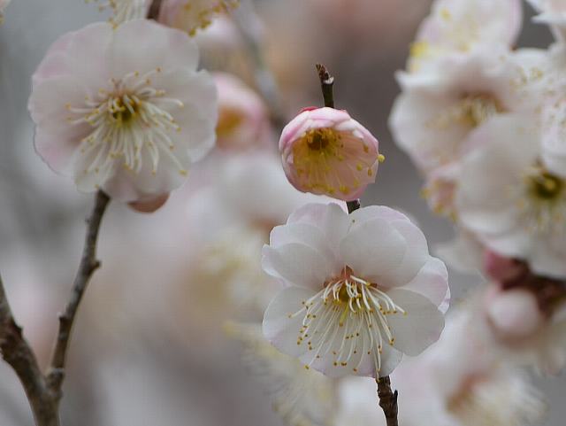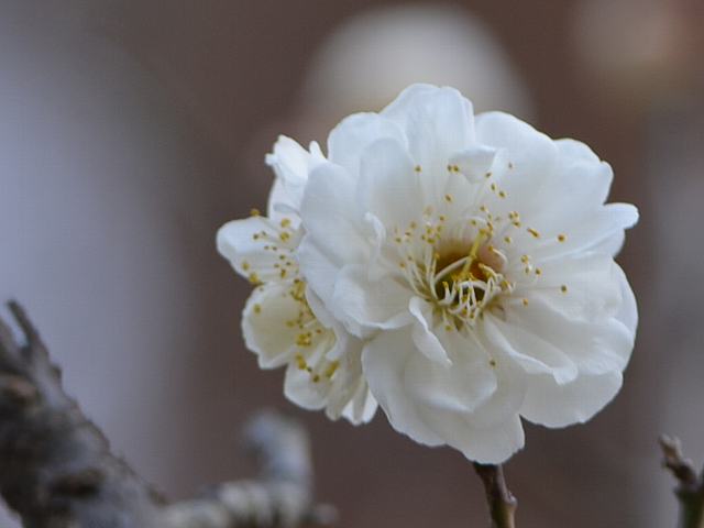 古城の春(コジョウノハル) 春の花 2014年03月22日 梅(ウメ)はバラ科サクラ属の落葉小高木である。中国原産で、日本へは古代に渡来した。古城の春(コジョウノハル)はその栽培品種の1つである。樹高は3メートルから6メートルくらいである。葉は楕円形で、互い違いに生える(互生)。開花時期は2月から3月である。葉の展開に先立って花を咲かせる。早咲きの品種である。野梅系・野梅性の白い八重咲きの中輪(花径20から25ミリ)で、ごく淡いピンクがかかる。なお、この園芸名は椿にも用いられている。属名の Prunus は「plum(スモモ)」を意味する。種小名の mume は「梅」のことである。写真は3月に国営武蔵丘陵森林公園で撮った。学名:Prunus mume 'Kojo-no-haru'★さっぱりと咲いた姿が梅らしく 地味だけれども親しみ増して花図鑑植物図鑑|味の麺匠戸田久|おこめの鬼平|フロム蔵王|花の本屋さん|楽天トラベル|
