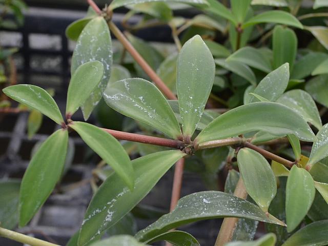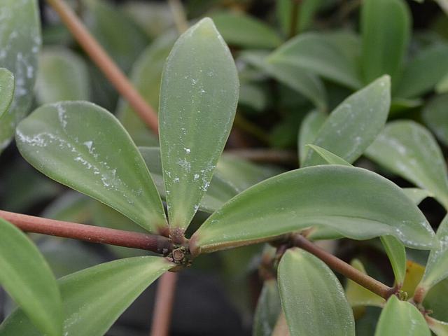 ペペロミア・ペレスキーフォリア 観葉植物 2014年02月22日 ペペロミア・ペレスキーフォリアはコショウ科サダソウ属(ペペロミア属)の多年草である。ペペロミア属はコショウ属の近縁で、世界の熱帯・亜熱帯地方に1500種くらいが分布する。日本にも暖地に佐田草(サダソウ:Peperomia japonica)が分布するので、属名の和名をサダソウ属という。本種の原産地はコロンビア、ベネズエラ、ブラジルである。日本では観葉植物とされる。草丈は30センチくらいである。葉は披針形(笹の葉のような形)で、4枚くらいの葉が輪生する。葉の質は革質で、先が尖る。開花時期は夏である。葉と対生して穂状花序(柄のない花が花茎に均等につく)を出し、小さな花をたくさんつける。属名の Peperomia はギリシャ語の「peperi(胡椒)+homoios(似た)」からきている。種小名の pereskiifolia は「コノハサボテン属(Pereskia)のような葉の」という意味である。写真は2月に北大植物園で撮った。学名:Peperomia pereskiifolia★葉の先が尖っているのが違うかな 仲間と言えど異なる個性花図鑑植物図鑑|味の麺匠戸田久|おこめの鬼平|フロム蔵王|花の本屋さん|楽天トラベル|