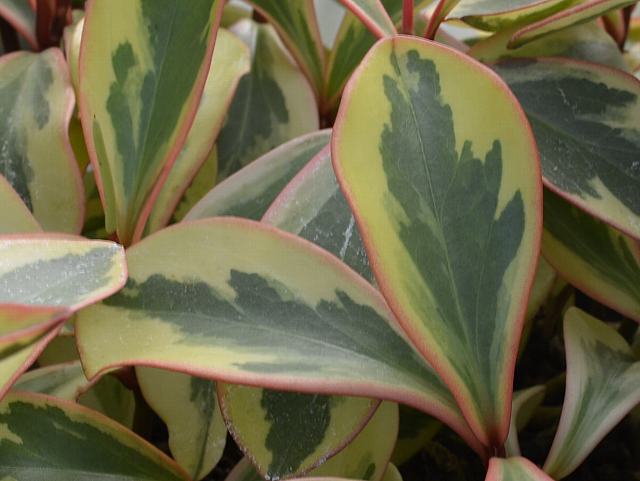 ペペロミア・クルシーフォリア・ジュエリー 観葉植物 2014年02月23日 ペペロミア・クルシーフォリアはコショウ科サダソウ属(ペペロミア属)の多年草である。ペペロミア属はコショウ属の近縁で、世界の熱帯・亜熱帯地方に1500種くらいが分布する。日本にも暖地に佐田草(サダソウ:Peperomia japonica)が分布するので、属名の和名をサダソウ属という。本種の原産地は西インド諸島やベネズエラである。いくつかの園芸品種があり、日本ではそれらが観葉植物とされる。ジュエリー(Jewelry)もそうした園芸品種の1つである。草丈は20センチから25センチくらいである。直立性である。葉は幅の広い楕円形で、互い違いに生える(互生)か輪生する。葉の色は濃い緑色で、淡い緑色の斑入りとなる。また、周辺部に紅色が入る。葉の質は多肉質で、先はやや尖り、縁にぎざぎざ(鋸歯)はない。開花時期は夏である。葉と対生して穂状花序(柄のない花が花茎に均等につく)を出し、小さな花をたくさんつけるが、あまり目立たない。属名の Peperomia はギリシャ語の「peperi(胡椒)+homoios(似た)」からきている。種小名の clusiifolia は「(オトギリソウ科)クルシア属(Clusia)のような葉の」という意味である。写真は2月に北大植物園で撮った。学名:Peperomia clusiifolia 'Jewelry'★斑の入る葉っぱが街に出回るが とても地味だねもとになる草花図鑑植物図鑑|味の麺匠戸田久|おこめの鬼平|フロム蔵王|花の本屋さん|楽天トラベル|