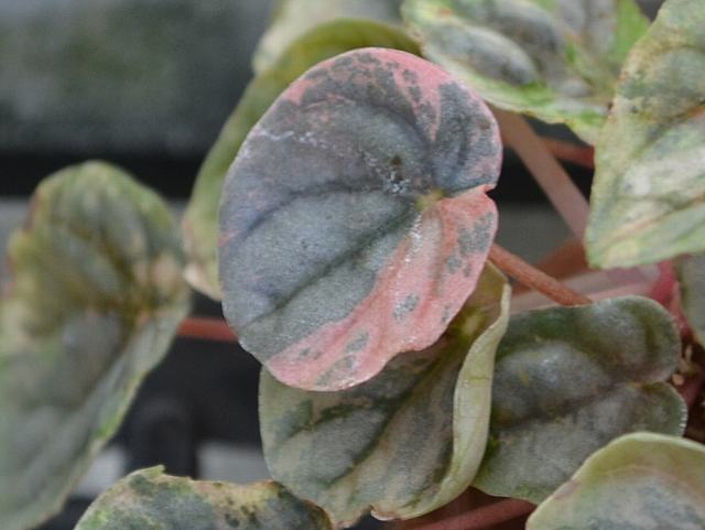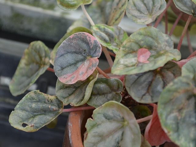 ペペロミア・グリセオアルゲンテア・バリエガタ 観葉植物 2014年02月28日 ペペロミア・グリセオアルゲンテアはコショウ科サダソウ属(ペペロミア属)の多年草である。ペペロミア属はコショウ属の近縁で、世界の熱帯・亜熱帯地方に1500種くらいが分布する。日本にも暖地に佐田草(サダソウ:Peperomia japonica)が分布するので、属名の和名をサダソウ属という。本種の原産地はブラジルである。日本では観葉植物とされる。英名はシルバーリーフ・ペペロミア(silver-leaf peperomia)という。バリエガタ(Variegata)はその園芸品種である。草丈は10センチから20センチくらいである。葉は卵円形で、ロゼット状に生える。葉は灰色を帯びた緑色で艶がある。葉の質は多肉質であり、葉脈は窪んで暗い色になる。開花時期は夏である。葉と対生して穂状花序(柄のない花が花茎に均等につく)を出し、小さな花をたくさんつけるが、あまり目立たない。属名の Peperomia はギリシャ語の「peperi(胡椒)+homoios(似た)」からきている。種小名の griseoargentea は「灰色を帯びた銀白色の」という意味である。写真は2月に北大植物園で撮った。学名:Peperomia griseoargentea 'Variegata'★斑が入る丸い葉っぱは神秘的 色合いさえも深みを見せて