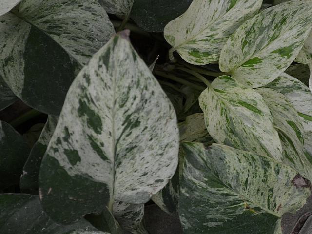 エピプレムヌム・アウレウム・マーブルクイーン 観葉植物 2014年03月01日 エピプレムヌム・アウレウムはサトイモ科ハブカズラ属(エピプレムヌム属)の蔓性常緑多年草である。エピプレムヌム属は東南アジアや西太平洋などに15種くらいが分布する小さな仲間である。日本にも沖縄に波布蔓(ハブカズラ:Epipremnum pinnatum)が分布するので、属名の和名をハブカズラ属という。本種の原産地はソロモン諸島である。日本へは明治時代に渡来し、観葉植物として人気がある。かつてはポトス属に分類されていたので、園芸的にはポトスの名で流通している。和名は黄金葛(オウゴンカズラ)という。マーブルクイーン(Marble Queen)はその園芸品種である。特徴は青緑色の葉に白い大理石のような模様が入ることである。草丈は1~2メートルである。茎は木質化し、気根が付着して樹上をよじ上る。大きく育てば10メートルを超える。葉は卵形で、互い違いに生える(互生)。属名の Epipremnum はギリシャ語の「epi(上)+premnon(樹幹)」からきている。種小名の aureum は「黄金色の」という意味である。写真は2月に北大植物園で撮った。学名:Epipremnum aureum 'Marble Queen'★昔から聞いて育ったポトスの名 由来に触れて納得をして花図鑑植物図鑑|味の麺匠戸田久|おこめの鬼平|フロム蔵王|花の本屋さん|楽天トラベル|
