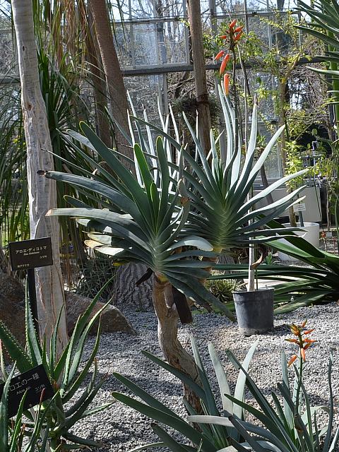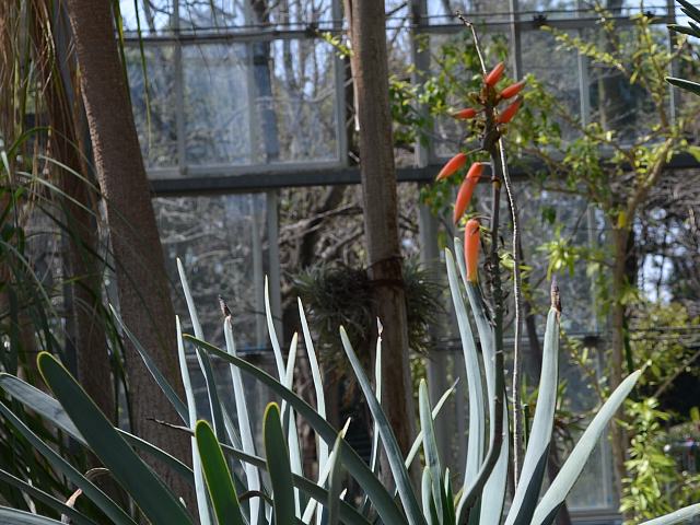 アロエ・プリカティリス 冬の花 2014年01月30日 アロエ・プリカティリスはユリ科アロエ属の常緑低木である。分類体系によっては(APGIII)ススキノキ科とされる。南アフリカのケープ地方の南西部に分布する。山地の砂礫地に生える多肉植物である。英名はファン・アロエ(fan aloe)という。ファンは扇のことである。園芸名は乙姫の舞扇(オトヒメノマイオウギ)という。草丈は3~5メートルくらいである。葉は披針形(笹の葉のような形)で、規則的に広がる。葉の色は灰緑色で先は尖らず、縁にはぎざぎざ(鋸歯)がある。開花時期は2月くらいである。オレンジ色をした長さ5センチくらいの筒状の花を垂れ下げる。花被片は6枚、雄しべも6本である。属名の Aloe は、アラビア語の「alloeh(苦味のある)」からきている。葉に苦い汁液があることから名づけられた。種小名の plicatilis は「折り畳まれた」という意味である。写真は3月につくば植物園で撮った。学名:Aloe plicatilis★木質のアロエはとても珍しい 舞姫思わす姿やさしく花図鑑植物図鑑|味の麺匠戸田久|おこめの鬼平|フロム蔵王|花の本屋さん|楽天トラベル|