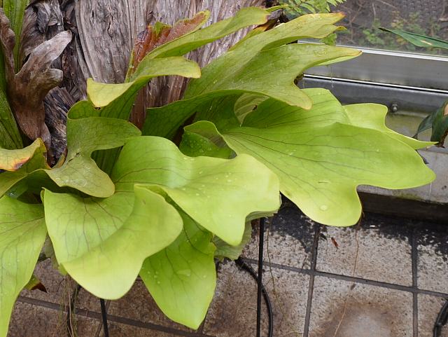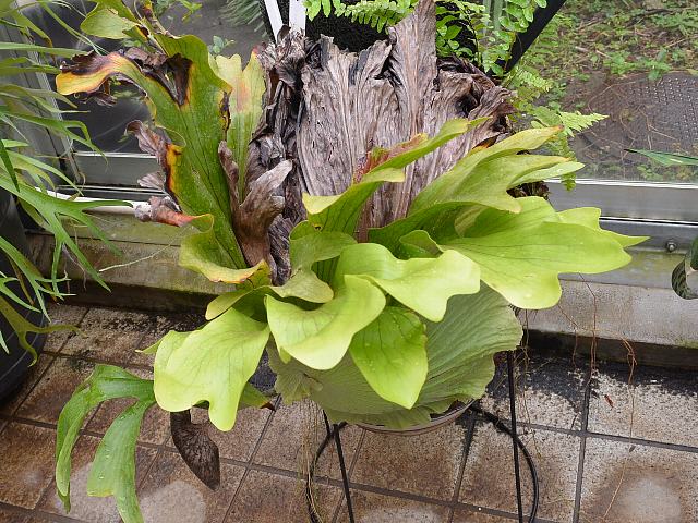 プラティケリウム・コロナリウム 観葉植物 2014年02月01日 プラティケリウム・コロナリウムはウラボシ科ビカクシダ属の常緑多年草である。明治時代に日本へ渡来した麋角羊歯(ビカクシダ)と同じ仲間である。ビカクシダ属は世界の熱帯・亜熱帯地方に18種くらいが分布するシダ植物である。本種はフィリピン、タイ、インドネシア、マレーシアなどに分布し、樹木に着生する大形種である。和名を大麋角羊歯擬き(オオビカクシダモドキ)とするものもある。麋(び)はオオジカを意味する。大麋角羊歯(オオビカクシダ:Platycerium grande)が別に存在する。草丈は60~200センチくらいである。葉は栄養葉と胞子葉の2種類がある。胞子葉が主に鑑賞する部分で、鹿の角のような形をしている。胞子葉には星状毛(放射状に伸びる毛)が生え、裏面は白い毛で覆われている。本種では細長く垂れ下がる。根茎から束になって生え(束生)ている腎円形の葉は栄養葉で冠のような形をしており、水を蓄える。属名の Platycerium はギリシャ語の「platys(広い)+ceras(つの)」からきている。葉の様子がオオジカの角のように広がることから名づけられた。種小名の coronarium は「冠をまとった」という意味である。写真は11月に川口市立グリーンセンターで撮った。学名:Platycerium coronarium★だらりんと垂れた姿と違うけど きっとこれから育つのだろね花図鑑植物図鑑|味の麺匠戸田久|おこめの鬼平|フロム蔵王|花の本屋さん|楽天トラベル|PR