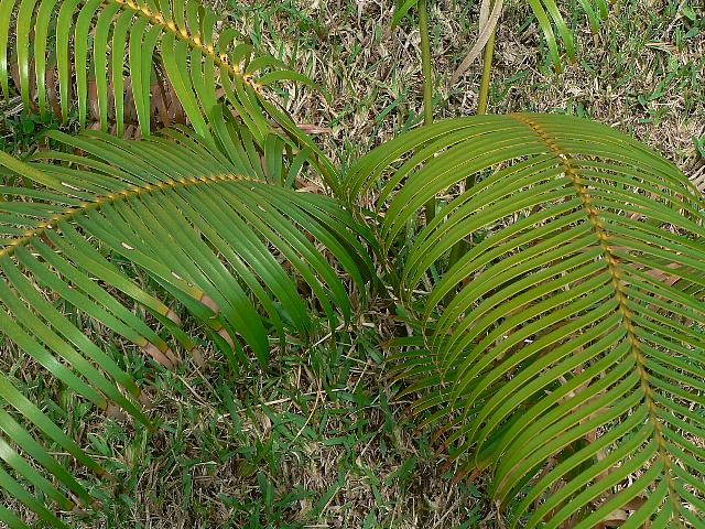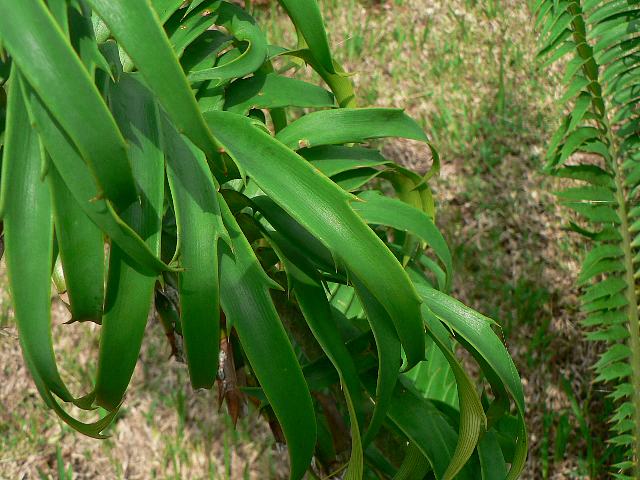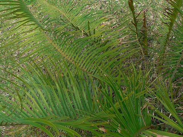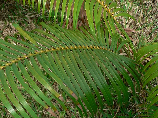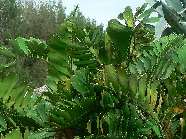 長葉鬼ザミア(ナガバオニザミア) 観葉植物 2013年12月20日 長葉鬼ザミア(ナガバオニザミア)はソテツ科オニザミア属(マクロザミア属)の常緑小高木である。分類体系によってはザミア科とされる。学名のマクロザミア・モーレーで表示するものもある。原産地はオーストラリアのクーインズランド州である。国際自然保護連合(IUCN)のレッドリスト(Ver.3.1, 2001)では軽度懸念(LC)に指定されている。樹高は7メートルに達する。立ち上がる幹は直径が50~80センチくらいある。葉は羽状複葉で、長さが250センチに達する。小葉の形は幅が狭く長い線形である。属名の Macrozamia はギリシャ語の「macros(大きい)+Zamia(ザミア属)」からきている。種小名の moorei はシドニー王立植物園の理事だった「ムーア(Charles Moore, 1820-1905)さんの」という意味である。写真は11月に沖縄県本部町の熱帯・亜熱帯都市緑化植物園で撮った。学名:Macrozamia moorei★すっくりと幹を伸ばして立ち上がる 姿はまるで椰子を思わせ花図鑑植物図鑑|味の麺匠戸田久|おこめの鬼平|フロム蔵王|花の本屋さん|楽天トラベル|
