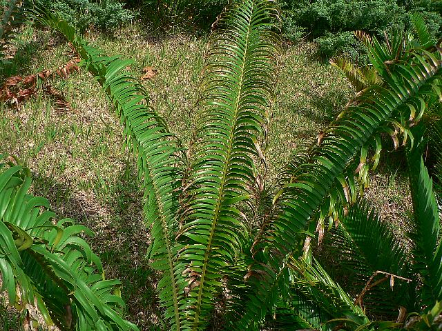 ディオーン・エデュレ 観葉植物 2013年12月19日 ディオーン・エデュレはソテツ科ディオーン属の常緑低木である。分類体系によってはザミア科とされる。ディオーン属は10種類がメキシコや中央アメリカに生育する。氷河期を生き延びた植物である。本種の原産地はメキシコの東海岸である。国際自然保護連合(IUCN)のレッドリスト(2010, ver. 3.1)では準絶滅危惧(NT)に指定されている。樹高は4メートルに達する。長さが1~2メートルある羽状葉は固くて艶があり、四方に広がる。葉の縁には棘がある。雌雄異株である。松笠のような形をした雌花は全体が白い毛で覆われている。種子は食用や薬用になる。属名の Dioon はギリシャ語の「dis(2つの)+oon(卵)」からきている。種小名の edule は「食用の」という意味である。写真は1月に新宿御苑で撮った。学名:Dioon edule★広げた葉硬く艶やか不思議さを 無くすことなく今に生き延び花図鑑植物図鑑|味の麺匠戸田久|おこめの鬼平|フロム蔵王|花の本屋さん|楽天トラベル|