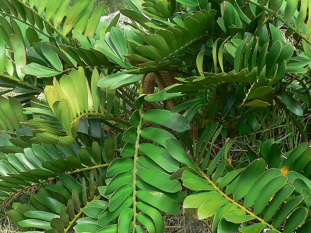 広葉ザミア(ヒロハザミア) 観葉植物 2013年12月21日 広葉ザミア(ヒロハザミア)はソテツ科ザミア属の常緑低木である。分類体系によってはザミア科とされる。原産地はメキシコ東部のベラクルズ州である。国際自然保護連合(IUCN)のレッドリスト(Ver.3.1, 2001)では絶滅危惧IB類(EN)に指定されている。樹高は1メートルくらいである。葉や茎には毛が密生している。葉は羽状複葉で、長さは50~150センチくらいである。小葉の形は楕円形で硬く、先は丸い。属名の Zamia はラテン語の「zamia(マツの実)」からきている。雌雄異株である。雌花も雄花も松笠のような形をしている。種小名の furfuracea は「粉だらけの」という意味である。写真は11月に沖縄県本部町の熱帯・亜熱帯都市緑化植物園で撮った。学名:Zamia furfuracea★葉の様子仲間と少し違ってる ずっしりしてる広葉ザミアは花図鑑植物図鑑|味の麺匠戸田久|おこめの鬼平|フロム蔵王|花の本屋さん|楽天トラベル|