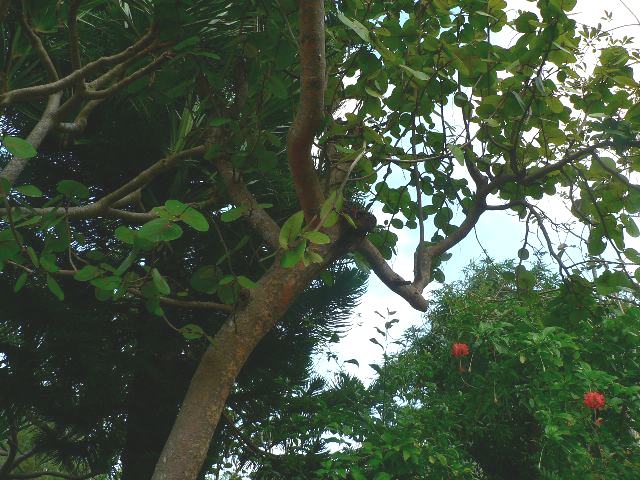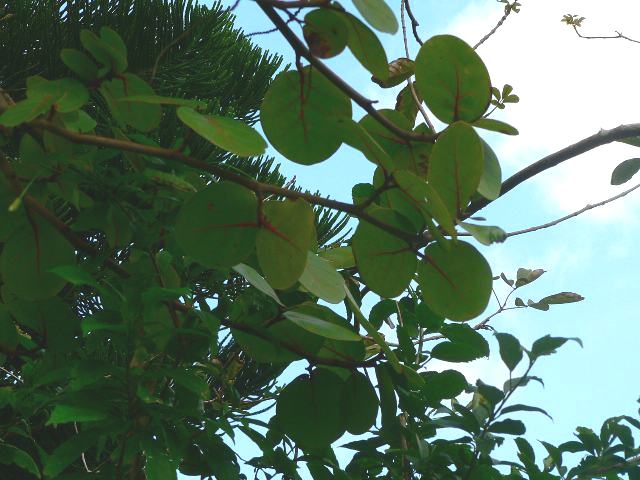 浜辺葡萄(ハマベブドウ) 秋の花 2013年12月15日 浜辺葡萄(ハマベブドウ)はタデ科ハマベブドウ属の常緑小高木である。原産地はアメリカ合衆国の南部、メキシコ、西インド諸島、ブラジルなどで、海辺や川辺に生える。日本へは明治時代に渡来した。英名はシーグレイプ (sea grape)、ショアグレイプ (shore grape)などである。樹高は5~8メートルくらいである。葉は丸い心臓形で、向かい合って生える(対生)。葉は革質で艶があり、縁は波状になる。雌雄異株である。開花時期は秋である。葉の脇から長さ15センチくらいの総状花序(柄のある花が花茎に均等につく)を出し、白い花をたくさんつける。花には蜜が多く、甘い香りがする。花の後にできる実は葡萄状の液果(果皮が肉質で液汁が多い実)で、赤紫色に熟する。実は生食にしたり、ジャムやゼリーなどに加工される。樹皮はインクの材料となり、材は細工用とされる。属名の Coccoloba はギリシャ語の「kokkos(液果の)+lobos(莢)」からきている。種小名の uvifera は「葡萄状の」という意味である。写真は11月に沖縄市の東南植物楽園で撮った。学名:Coccoloba uvifera★実や花の姿もいつか見てみたい 丸い葉っぱだ浜辺葡萄は