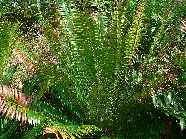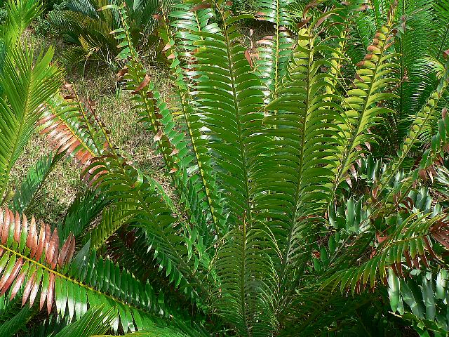 エンケファラルトス・スクラボイ 観葉植物 2013年12月16日 エンケファラルトス・スクラボイはソテツ科オニソテツ属の常緑低木である。分類体系によってはザミア科とされる。原産地はタンザニアで、標高1800~2100メートルの山地の森に生える。1990年にフランス人の学生スクラボさんが発見した。氷河期を生き延びた植物である。国際自然保護連合(IUCN)のレッドリスト(Ver. 3.1, 2001)では絶滅危惧IA類(CR)に指定されている。樹高1メートルくらいである。葉は羽状複葉で、長くて艶があり不規則に捩れる。雌雄異株である。長い松笠のような形をした雄花の色は黄色である。属名の Encephalartos はギリシャ語の「en(中)+kephali(頭部)+artos(パン)」からきている。種小名の sclavoi は発見者であるフランス人の学生「スクラボ(Jean Pierre Sclavo, 1990発見)さんの」という意味である。写真は11月に沖縄県本部町の熱帯・亜熱帯都市緑化植物園で撮った。学名:Encephalartos sclavoi★どれも皆目を奪うほどめずらしく うきうきとしてカメラに収め花図鑑植物図鑑|味の麺匠戸田久|おこめの鬼平|フロム蔵王|花の本屋さん|楽天トラベル|