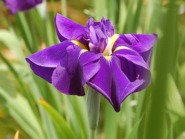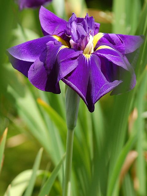 夜嵐(ヨアラシ) 夏の花 2016年06月06日 花菖蒲(ハナショウブ)はアヤメ科アヤメ属の多年草である。野花菖蒲(ノハナショウブ)を改良した園芸品種である。ただし、学名上は花菖蒲(ハナショウブ)のほうが基本種の扱いになっている。古典園芸植物で非常に多くの品種がある。夜嵐(ヨアラシ)はそうした園芸品種の1つである。(花菖蒲図鑑参照)系統は肥後系である。草丈は50センチくらいである。葉は剣状で、2列に互い違いに生える(互生)。開花時期は6月である。花の色は濃い紫色である。6英のやや垂れた平咲きで、花径は20センチくらいの極大輪である。花柱枝が直立しているのが特徴である。属名の Iris はギリシャ語で虹を意味する。種小名の ensata は「剣形の」という意味である。写真は6月に葛飾区の堀切菖蒲園で撮った。学名:Iris ensata 'Yoarashi'★めずらしい花の形に目も丸く どんな工夫と驚きながら花図鑑植物図鑑ミラーサイト|味の麺匠戸田久|おこめの鬼平|フロム蔵王|花の本屋さん|楽天トラベル|