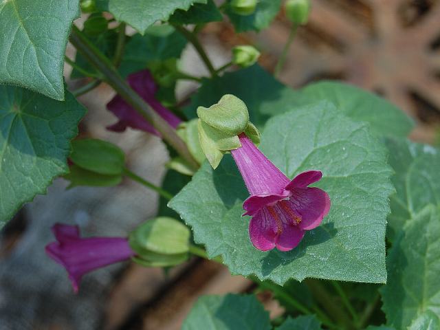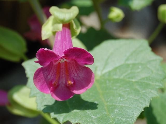 ロフォスペルムム・プルプシー 夏の花 2016年06月09日 ロフォスペルムム・プルプシーはゴマノハグサ科ロフォスペルムム属の多年草である。分類体系によっては(APG第3版)オオバコ科とされる。ロフォスペルムム属はメキシコとグアテマラの山岳地帯に分布し、 The Plant List では7種が認められている。同属はかつてはアサリナ属(Asarina)に含まれていたが、現在ではアサリナ属はヨーロッパに分布するものだけに限定する学説が主流となってきた。本種の原産地はメキシコである。草丈は40センチから60センチくらいである。葉は角張っていて蔦(ツタ)に似ており、互い違いに生える(互生)。開花時期は5月から10月である。花冠は筒状で先が唇形となり、上唇は2つ、下唇は3つに裂ける。花の色は紅紫色で、花冠のつけ根は緑色の苞(葉の変形したもの)が包んでいる。花の後にできる実はさく果(熟すると下部が裂け、種子が散布される果実)である。属名の Lophospermum はギリシャ語の「lopho(とさか状の)+spermum(種子)」からきている。種小名の purpusii はドイツからの移民でコレクターの「パーパス(Carl Albert Purpus, 1851-1941)さんの」という意味である。写真は6月に神奈川県立フラワーセンター大船植物園で撮った。園芸品種のビクトリアフォールズ(Victoria Falls)である。学名:Lophospermum purpusii(syn. Asarina purpusii)★メキシコの山岳地帯に咲くという 花との出合い記憶に刻み花図鑑植物図鑑ミラーサイト|味の麺匠戸田久|おこめの鬼平|フロム蔵王|花の本屋さん|楽天トラベル|
