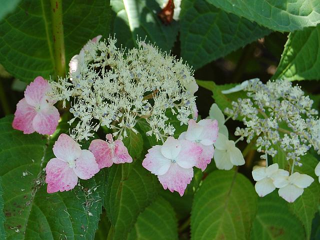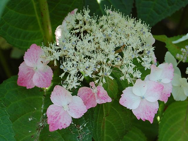 紅額(ベニガク) 夏の花 2016年06月10日 紅額(ベニガク)はユキノシタ科アジサイ属(ヒドランゲア属)の落葉小低木である。分類体系によっては(APG第3版)アジサイ科とされる。ヒドランゲア属はアジアと南北アメリカ大陸に70種くらいが分布する。また、多くの園芸品種が作出されている。(紫陽花図鑑参照)日本にも紫陽花(アジサイ)などが栽培され、属名の和名はアジサイ属という。本種は江戸時代から栽培されている園芸品種である。庭木や公園樹とされている。従来は山紫陽花(ヤマアジサイ)の品種の1つと考えられていた。しかし、最近の研究で蝦夷紫陽花(エゾアジサイ)との中間的形質をもつことがわかってきた。そのため下記のように学名も変化してきている。樹高は50センチから100センチくらいである。葉は楕円形でやや細長く、向かい合って生える(対生)。葉には艶がなく、縁には細かいぎざぎざ(鋸歯)がある。開花時期は6月から7月くらいである。中心に多数の両性花、周辺に装飾花がある。両性花の色は白く、装飾花は白から紅色へと変わる。花の後にできる実はさく果(熟すると下部が裂け、種子が散布される果実)である。ヨーロッパに持ち帰られて赤色系の西洋紫陽花(セイヨウアジアイ)の交配親になっているともいわれて。属名の Hydrangea はギリシャ語の「hydro(水)+angeion(容器)」からきている。さく果の形からから名づけられた。種小名の serrata は「鋸歯のある」という意味である。変種名の japonica は「日本の」という意味である。写真は6月に神奈川県立フラワーセンター大船植物園で撮った。学名:Hydrangea serrata var. japonica(syn. Hydrangea serrata var. serrata f. rosalba)★紅色にほんのり色づく飾り花 江戸の世からの贈り物だね花図鑑植物図鑑ミラーサイト|味の麺匠戸田久|おこめの鬼平|フロム蔵王|花の本屋さん|楽天トラベル|