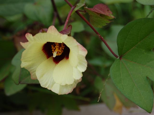 ドワーフコットン 秋の花 2013年09月12日 ドワーフコットンはアオイ科ワタ属の多年草である。木立綿(キダチワタ:Gossypium arboreum)系の園芸品種で、「サカタのタネ」から発売されている。草丈20~25センチで咲き始める矮性品種である。園芸上は一年草として扱われる。木立綿(キダチワタ)の原産地はインド、パキスタンである。草丈は20~60センチくらいである。葉は手のひら状に裂け、互い違いに生える(互生)。開花時期は8~10月である。花径4センチくらいの黄色い5弁花で、花の真ん中が赤褐色をしている。花は一日花である。花の後にできる実はさく果(熟すると下部が裂け、種子が散布される果実)である。ひと月くらいで熟して裂開し、白い綿毛が露出する。属名の Gossypium はラテン語の「gossum(腫れ物)」からきている。膨らんだ果実の形をたとえたものである。種小名の arboreum は「樹木の」という意味である。写真は9月に神奈川県立フラワーセンター大船植物園で撮った。学名:Gossypium arboreum 'Dwarf Cotton'★綿だって園芸用になるんだよ ドワーフの名もどこか可愛く花図鑑植物図鑑|味の麺匠戸田久|おこめの鬼平|フロム蔵王|花の本屋さん|楽天トラベル|