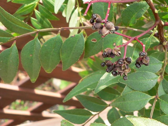 犬山椒(イヌザンショウ) 秋の花 2013年09月13日 犬山椒(イヌザンショウ)はミカン科サンショウ属の落葉低木である。本州から九州にかけて分布し、低地の林の中に生える。海外では、朝鮮半島や中国にも分布する。樹高は1~3メートルくらいである。枝には棘があり、互い違いに生える(互生)。山椒(サンショウ)の場合は、1組ずつ向かい合って生える(対生)。葉は奇数羽状複葉(鳥の羽のように左右に小葉がいくつか並び、先に1つの小葉がついて1枚の葉が構成される)で、互い違いに生える(互生)。小葉の形は長めの楕円形で、縁には細かく先が鈍いぎざぎざ(鋸歯)がある。葉には悪臭がある。開花時期は8~9月である。雌雄異株である。散房花序(柄のある花がたくさんつき、下部の花ほど柄が長いので花序の上部がほぼ平らになる)を出し、淡い黄緑色の花をたくさんつける。花の後にできる実は分果(複数の子房からできた果実)で3つのブロックからなり、円形で熟すと黒くなる。和名の由来は、葉が「山椒」に似るが役に立たない(「犬」)というところからきている。葉や種子は民間療法で湿布薬とされる。属名の Zanthoxylum はギリシャ語の「Zantho(黄色い)+xilon(木質)」からきている。この属の植物が黄色染料として使われることから名づけられた。種小名の schinifolium は「ウルシ科コショウボク属(Schinus)のような葉の」という意味である。写真は10月に箱根湿生花園で撮った。学名:Zanthoxylum schinifolium★それぞれに生きればいいさそれなりに 犬山椒は風に吹かれて花図鑑植物図鑑|味の麺匠戸田久|おこめの鬼平|フロム蔵王|花の本屋さん|楽天トラベル|