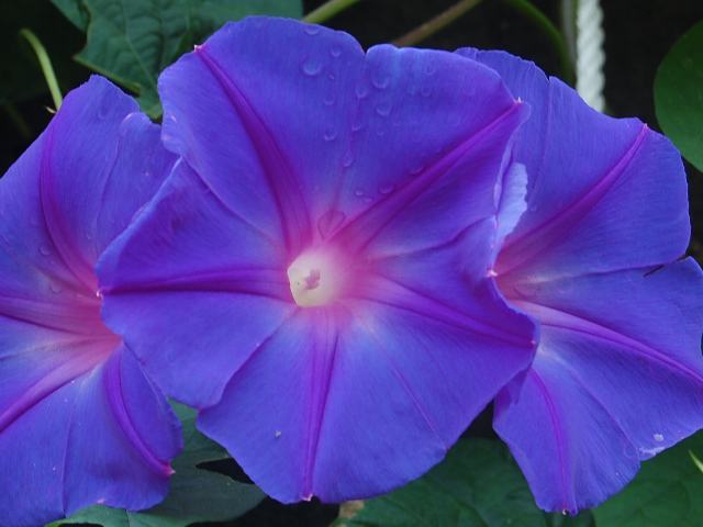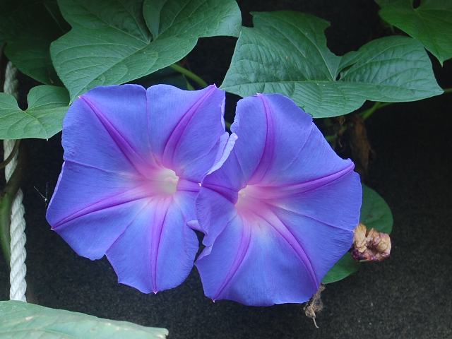 オーシャンブルー 秋の花 2013年09月15日 野朝顔(ノアサガオ)はヒルガオ科サツマイモ属(イポメア属)の多年草である。本州の伊豆諸島、紀伊半島、小笠原諸島と四国から沖縄にかけて分布し、海岸や道ばたなどに生える。海外では、熱帯から温帯にかけて広く分布する。オーシャンブルー(Ocean Blue)はその園芸品種の1つで代表的な品種である。特徴は、花の色が鮮やかなことである。咲き始めは青紫色で、次第に紫色に変わる。茎は濃い紅紫色で、草丈は10メートル以上になる。葉は心形で、互い違いに生える(互生)。葉の縁は波打ち、先は尖る。葉には疎らに毛が生える。開花時期は6月から12月くらいである。沖縄では周年開花をする。花径は5センチから8センチくらいで、漏斗状である。花は朝開き、昼にはしぼむ。花の柄には2枚の苞(花のつけ根につく葉の変形したもの)がつく。花の後にできる実はさく果(熟すると下部が裂け、種子が散布される果実)である。属名の Ipomoea はギリシャ語の「ips(芋虫)+homoios(似た)」からきている。物に絡みついて這い登る性質からから名づけられた。種小名の indica は「インドの」という意味である。写真は9月に富山県中央植物園で撮った。学名:Ipomoea indica 'Ocean Blue'★玄関を派手に彩り垂れ下がる オーシャンブルーに心うきうき花図鑑植物図鑑|味の麺匠戸田久|おこめの鬼平|フロム蔵王|花の本屋さん|楽天トラベル|