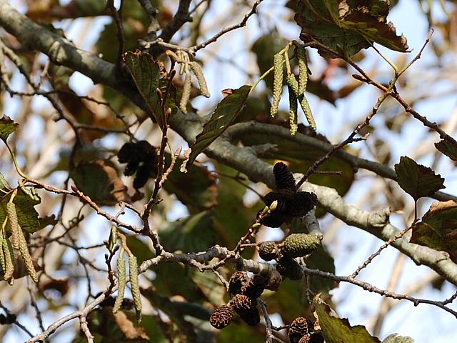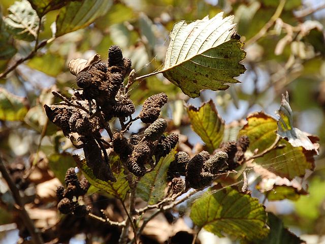 山榛の木(ヤマハンノキ) 果実・野菜 2013年09月16日 山榛の木(ヤマハンノキ)はカバノキ科ハンノキ属の落葉高木である。北海道から九州にかけて分布し、山地に生える。海外では、朝鮮半島、中国、サハリン、カムチャツカ半島、東シベリアなどにも分布する。分類上は、毛山榛の木(ケヤマハンノキ)の変種とされている。基本種との違いは葉に毛が生えないことである。樹高は5~20メートルくらいである。葉は卵円形で、互い違いに生える(互生)。葉の先は尖り、縁には不揃いのぎざぎざ(鋸歯)がある。葉の表面は無毛で、裏面は白っぽい。雌雄同株である。開花時期は3~4月である。雄花も雌花も紫褐色である。雄花は尾状に垂れ、雌花は上向きに立つ。花の後にできる実は楕円形の松毬状で、9~10月に緑色から褐色に熟する。材は器具材、土木材などに利用される。属名の Alnus はケルト語の「al(近く)+lan(海岸)」からきているとの説もあるラテン語の古名である。種小名の hirsuta は「粗い毛のある」という意味である。変種名の siberica は「シベリアの」という意味である。写真は11月につくば植物園で撮った。学名:Alnus hirsuta var. sibirica★榛の木の仲間もいろいろあるんだね 違いはどこか調べてみよう花図鑑植物図鑑|味の麺匠戸田久|おこめの鬼平|フロム蔵王|花の本屋さん|楽天トラベル|PR