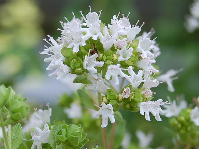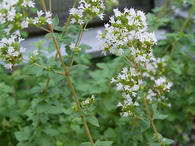 ポットマジョラム 夏の花 2013年08月29日 ポットマジョラム(pot marjoram)はシソ科ハナハッカ属の多年草である。原産地はギリシャ、トルコ、シリア、シシリー島などである。花薄荷(ハナハッカ:Origanum vulgare)の近縁種である。学名のオリガヌム・オニテスで表示するものもある。草丈は30~60センチくらいである。葉は卵形で、向かい合って生える(対生)。開花時期は6~9月くらいである。茎先や葉の脇から円錐花序(下のほうになるほど枝分かれする回数が多く、全体をみると円錐形になる)を出し、白い唇形の花をたくさんつける。花の後にできる実は分果(複数の子房からできた果実)で、4つのブロックからなる。観賞用とされるほか、ドライフラワーなどにも利用される。また、茎や葉にはハッカに似た香りがあり、料理の香りづけやアロマオイルに利用される。去痰、駆風などの薬効もある。花言葉は「実質」である。属名の Origanum は、ギリシャ語の「oros(山)+ganos(喜び)」からきている。種小名の onites の由来はまだ調べられていない。写真は6月につくば植物園で撮った。学名:Origanum onites★純白の花は手招く蝶や蜂 ニンフ思わすポットマジョラム花図鑑植物図鑑|味の麺匠戸田久|おこめの鬼平|フロム蔵王|花の本屋さん|楽天トラベル|