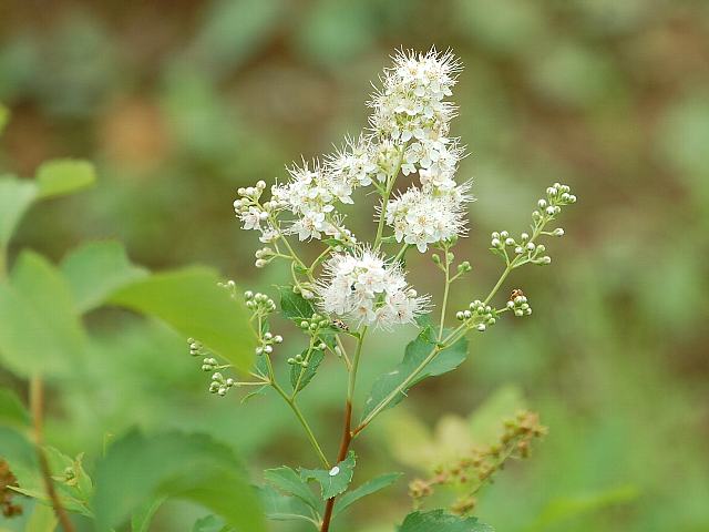スピラエア・アルバ・ラティフォリア 夏の花 2013年08月30日 スピラエア・アルバ・ラティフォリアはバラ科シモツケ属の落葉小低木である。原産地は北アメリカである。カナダのケベック州からアメリカ合衆国のジョージア州にかけて東海岸に分布する。分類上はスピラエア・アルバの変種とされている。基本種との違いは葉の幅が広いことである。ただし、基本種と区別しない考え方もある。一般名はホワイト・メドウスイート(white meadowsweet)という。メドウスイートはシモツケの仲間のことである。樹高は1~2メートルである。葉は卵形で、互い違いに生える(互生)。葉の先は尖り、縁には粗いぎざぎざ(鋸歯)がある。開花時期は7~9月である。枝先に穂状の総状花序(柄のある花が花茎に均等につく)を出し、白い小さな花を密につける。花びらは5枚で、雄しべが長く突き出る。花の後にできる実は袋果(熟すと果皮が自然に裂けて種子を放出する)である。属名の Spiraea はギリシャ語の「speira(螺旋)」に由来する。果実が螺旋状になるものがあることから名づけられた。種小名の alba は「白い」という意味である。変種名の latifolia は「広葉の」という意味である。写真は9月に富山県中央植物園で撮った。学名:Spiraea alba var. latifolia★日本ではまだここでしか出合えない 花を見つけて笑みのこほれて花図鑑植物図鑑|味の麺匠戸田久|おこめの鬼平|フロム蔵王|花の本屋さん|楽天トラベル|
