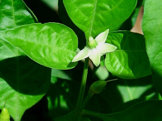 タバスコペッパー 秋の花 2013年08月31日 タバスコペッパー(tabasco pepper)はナス科トウガラシ属の多年草である。原産地はメキシコである。木立唐辛子(キダチトウガラシ)の仲間の1つである。木立唐辛子(キダチトウガラシ)の原産地はアマゾン川流域の低地とされている。現在では、熱帯から亜熱帯にかけた地域で広く栽培されている。日本でも南西諸島や小笠原諸島で栽培されている。沖縄にある島唐辛子(シマトウガラシ)もこの仲間である。多年草だが、1年もすると茎は木質化を始める。タバスコペッパーはその変種として位置づけられている。本種をもとにマキルヘニー社によってタバスコソースが開発された。また、本種は辛味が特に強く、ヨーロッパに持ち帰られて多数の栽培品種を生むもととなった品種だとされている。草丈は1~2メートルである。葉は幅の広い卵形で、互い違いに生える(互生)。開花時期は8~10月くらいである。花の色は黄緑色である。花冠は5つに裂ける。果実は5~7センチくらいの大きさで、やや丸みがある。果肉が厚く多汁質であるので、乾燥用には不向きとされている。実が赤くなりはじめたら収穫できる。属名の Capsicum はギリシャ語の「kapsa(袋)」からきている。袋状の果実であることから名づけられた。種小名の frutescens は「低木状の」という意味である。変種名の tabasco はメキシコ南東部の「タバスコ州(Estado de Tabasco)」のことである。写真は8月に神奈川県立フラワーセンター大船植物園で撮った。学名:Capsicum frutescens var. tabasco★生の味どんななのかと想像し 触ってみたよタバスコペッパー花図鑑植物図鑑|味の麺匠戸田久|おこめの鬼平|フロム蔵王|花の本屋さん|楽天トラベル|