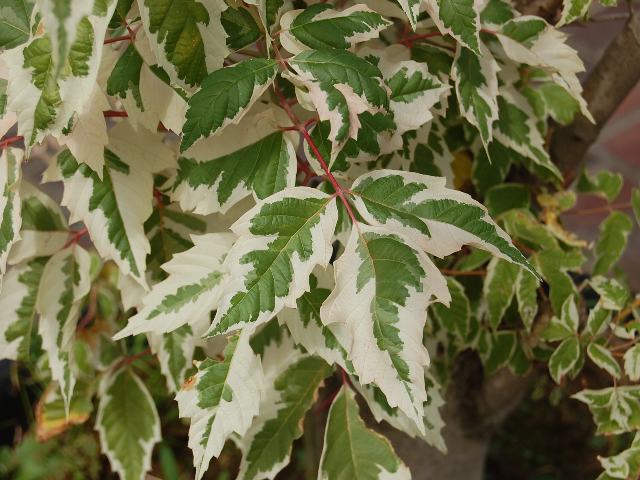 ネグンド楓(ネグンドカエデ) 観葉植物 2013年09月01日 ネグンド楓(ネグンドカエデ)はカエデ科カエデ属の落葉高木である。原産地は北アメリカである。カナダの中西部からアメリカの東部にかけて大西洋岸を中心に分布している。標準和名はとねりこ葉の楓(トネリコバノカエデ)という。バットの原材料などに使われるとねりこ(トネリコ)の葉に似ているということでつけられた名である。日本へは明治時代の初期に渡来した。寒冷地向きということで、北海道では街路樹とされている。また、逸出したものが野生化している。北海道のブルーリストではBランク(北海道に定着している外来種)に選定されている。成長の早い木で、樹高は10~15メートルくらいになる。葉は3~5枚の羽状複葉で、小葉の形は卵形である。斑入りの園芸品種「フラミンゴ(Flamingo)」の葉は白い覆輪が入り、桃色を帯びてトリカラーになるものもある。開花時期は4月である。雌雄異株である。葉に先立って花が咲く。黄緑色をした花弁のない花が垂れ下がって咲く。結実時期は8~10月である。花の後にできる実は分果(複数の子房からできた果実)で、2つのブロックからなる。実は食用になる。樹液は、メイプルシロップやメイプルシュガーとして利用される。属名の Acer は「裂ける」という意味のラテン語からきている。種小名の negundo はサンスクリット由来で「3ないし5の数」という意味である。品種名の flamingo はラテン語の「flamma(炎)」からきている。写真は9月に神奈川県立フラワーセンター大船植物園で撮った。園芸品種の「フラミンゴ」である。学名:Acer negundo★寒冷地気にせず育つ元気者 ネグンド楓の葉は美しく花図鑑植物図鑑|味の麺匠戸田久|おこめの鬼平|フロム蔵王|花の本屋さん|楽天トラベル|PR