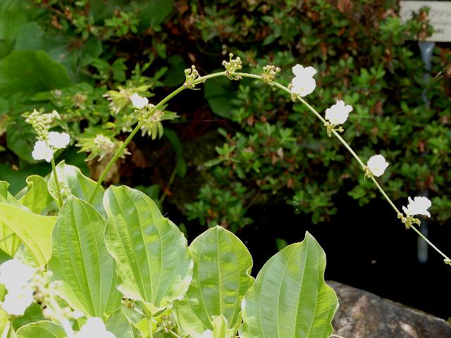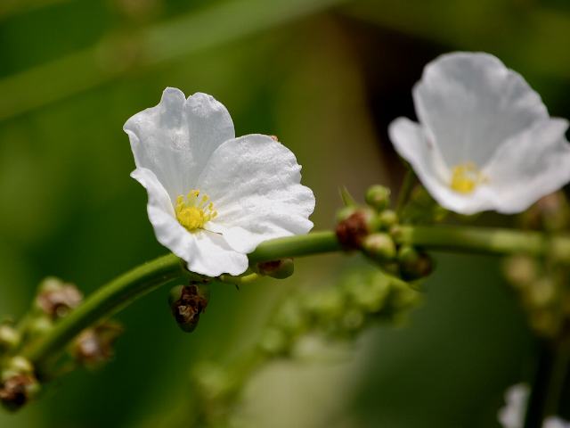 広葉車前面高(ヒロハシャゼンオモダカ) 夏の花 2013年08月19日 広葉車前面高(ヒロハシャゼンオモダカ)はオモダカ科エキノドルス属の多年草である。中南アメリカに分布し、水中に生える。日本へは水槽用の水草として導入されている。一部で栽培逸出したものが帰化している。和名は、車前面高(シャゼンオモダカ:Echinodorus cordifolius)と同属で葉の幅が広いことからつけられた。「車前」はオオバコを意味し、葉の形をなぞらえたものである。学名のエキノドルス・グランディフロルス・アウレウスで表示するものもある。撮影地もこの名称を用いている。草丈は20~45センチくらいである。葉は円形で、縁にぎざぎざ(鋸歯)はない(全縁)。葉のつけ根の部分は心形である。葉の色は黄色っぽい。開花時期は7~10月くらいである。花は白い3弁花である。オモダカ科としては大きな花をつける。花の後にできる実はそう果(熟しても裂開せず、種子は1つで全体が種子のように見えるもの)である。属名の Echinodorus はギリシャ語の「echino(はりねずみ)+doros(革製の瓶)」からきている。種小名の grandiflorus は「大きな花の」という意味である。亜種名の aureus は「黄金色の」という意味である。写真は7月につくば植物園で撮った。学名:Echinodorus grandiflorus subsp. aureus★大輪にほっと驚き目をやれば 花の形は沢瀉に似て花図鑑植物図鑑|味の麺匠戸田久|おこめの鬼平|フロム蔵王|花の本屋さん|楽天トラベル|