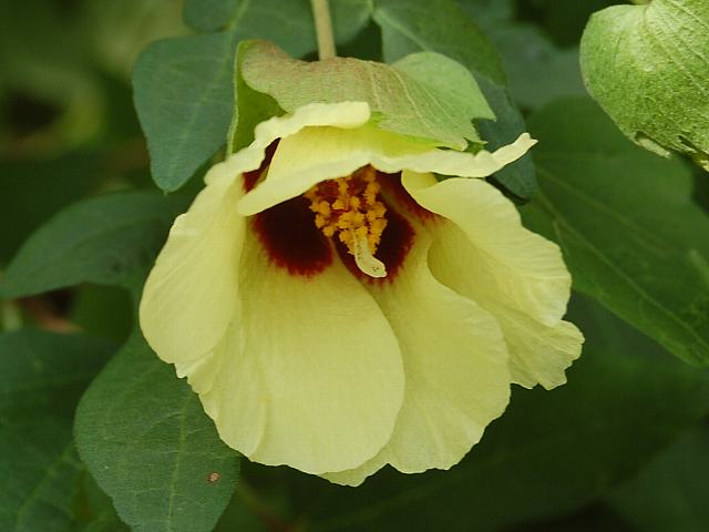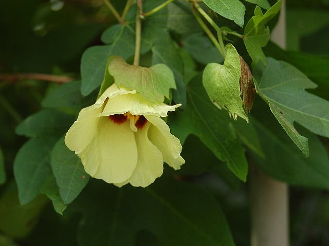 南京綿(ナンキンワタ) 夏の花 2013年08月20日 南京綿(ナンキンワタ)はアオイ科ワタ属の一年草である。原産地は中国である。「南京」は産地を表すものではなく唐(から)と同様に外国からきたことを表す言葉である。木立綿(キダチワタ:Gossypium arboreum)の系統で、インドから中国に渡って品種改良された。草丈は1メートルくらいである。葉は手のひら状に裂け、互い違いに生える(互生)。開花時期は7月から9月である。花径3殻センチくらいの黄色い5弁花をつける。花は一日花である。実は卵形のさく果(熟すると下部が裂け、種子が散布される果実)で、熟すと裂けて開き、長い綿毛のある種子を出す。実は小さく綿毛も短い。繊維は褐色なので茶綿(チャメン)とも呼ばれる。脱脂綿や布団綿などに用いられる。綿(ワタ:Gossypium arboreum var. obtusifolium)として一般化し、区別しない考え方もある。属名の Gossypium はラテン語の「腫れ物(gossum)」からきている。膨らんだ果実の形を腫れ物にたとえたものである。種小名の nanking は「南京」の意味である。写真は9月に東京都薬用植物園で撮った。学名:Gossypium nanking★調べれば由来楽しい南京綿 きっとお世話になっているはず花図鑑植物図鑑|味の麺匠戸田久|おこめの鬼平|フロム蔵王|花の本屋さん|楽天トラベル|
