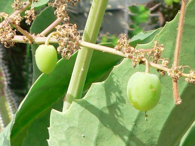 葡萄甕(ブドウガメ) 夏の花 2013年08月21日 葡萄甕(ブドウガメ)はブドウ科キフォステンマ属の多年草である。原産地は南アフリカとナミビアである。乾燥した地域に生える多肉植物である。国際自然保護連合(IUCN)のレッドリスト(Ver. 3.1, 2001)では軽度懸念(LC)に指定されている。草丈は2メートルに達する。円錐形ないし円筒形の巨大な塊茎から茎を伸ばす。葉は大きな卵形である。冬には落葉をする。開花時期は夏である。黄緑色の小さな目立たない花をたくさんつける。花の後にできる実は液果(果皮が肉質で液汁が多い実)である。ブドウに似て房状につき、紅紫色に熟する。ただし、実は有毒なので食用には適さない。属名の Cyphostemma はギリシャ語の「kyphos(隆起する)+stemma(花飾り)」からきている。種小名の juttae はドイツ人の植物学者クルト(Kurt Dinter, 1868-1945)さんの妻「ユタ(Jutta Dinter)さん」の名からきている。写真は6月につくば植物園で撮った。学名:Cyphostemma juttae★ぷっくりと膨れた根っこにびっくりだ 乾いた土地もこれで攻略花図鑑植物図鑑|味の麺匠戸田久|おこめの鬼平|フロム蔵王|花の本屋さん|楽天トラベル|